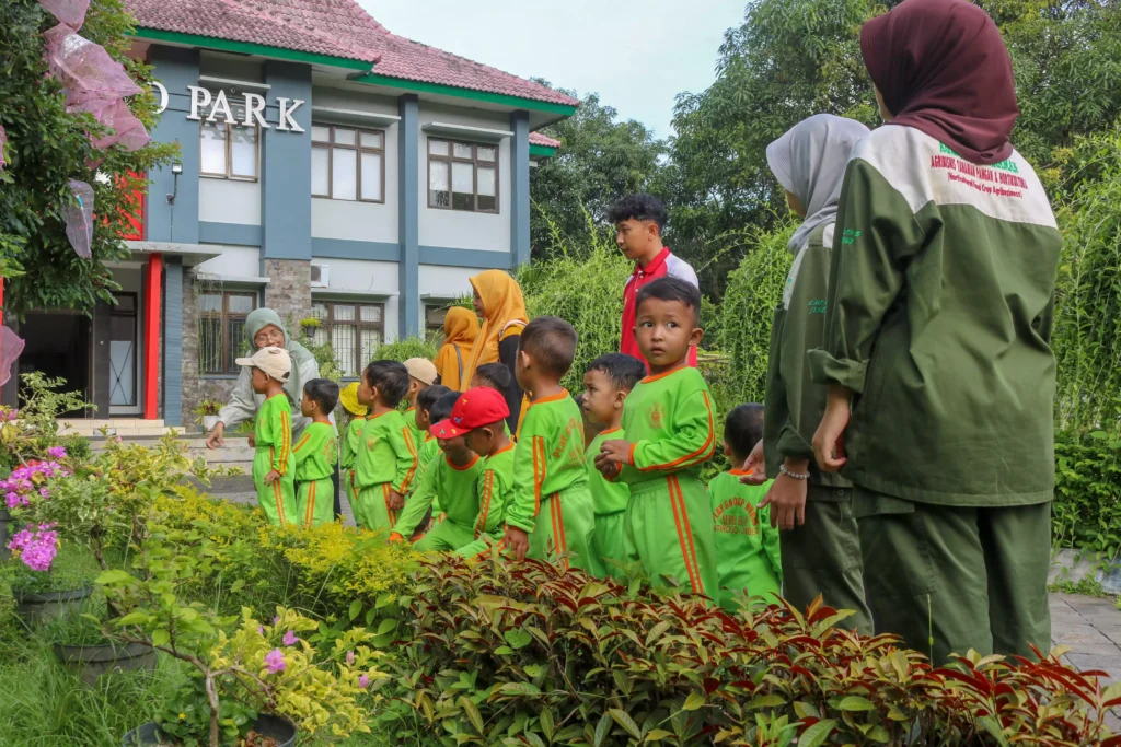 Agenda inti dimulai dengan mengajak para siswa menjelajahi area taman. Perhatian siswa langsung tertuju pada keanekaragaman tanaman hias dan keunikan akar gantung pada pohon-pohon besar yang ada. Pemandu menjelaskan fungsi akar tersebut dengan cara yang interaktif, memancing rasa ingin tahu para siswa.